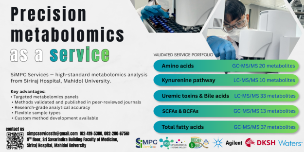 ✨ SiMPC Service ✨ 🔬 Introducing SiMPC Services — high-standard metabolomics analysis from Siriraj Hospital, Mahidol University. We offer 5 targeted analytical services covering amino acids, tryptophan/kynurenine metabolites, uremic toxins, bile acids, SCFAs, and total fatty acids. What sets us apart: every method we offer has been rigorously validated and published in peer-reviewed journals. You get…