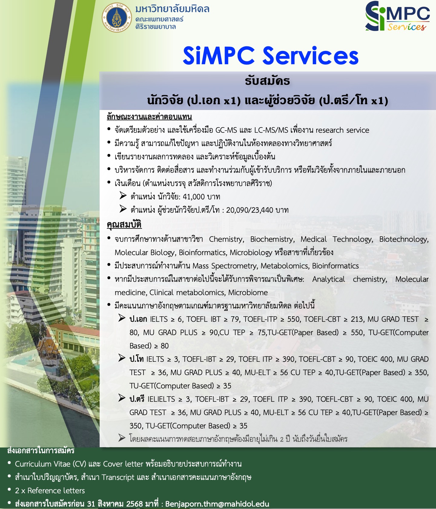 Share this post Share on FacebookShare on Facebook Share on LinkedInShare on LinkedIn Pin itShare on Pinterest Share on WhatsAppShare on WhatsApp TweetShare on Twitter Post navigationPreviousPrevious post:We are Hiring! (Today- 31 August 2025)NextNext post:Seminar: MS Horizons 2025: Innovation, Imaging, Ion mobility, and ImpactRelated postsWe are Hiring! (Today- 31 October 2025)September 22, 2025Seminar: MS Horizons 2025: Innovation, Imaging, Ion mobility, and ImpactJuly 23, 2025We are Hiring! (Today- 31 August 2025)July 2, 2025Metabolomics and Systems Biology Seminar: Mass Spectrometry Imaging for Studying Biodistribution and Biochemical Effects of NanomaterialsJune 19, 2025Opening Ceremony of SiMPC Services: Siriraj Metabolomics and Phenomics Center Services (SiMPC Services) (July 16, 2025)June 17, 2025Metabolomics and Systems Biology Seminar 20-06-2025: Metabolomics and Systems Biology Seminar, Benton Berigan, PhD (The CellScape instrument)May 27, 2025